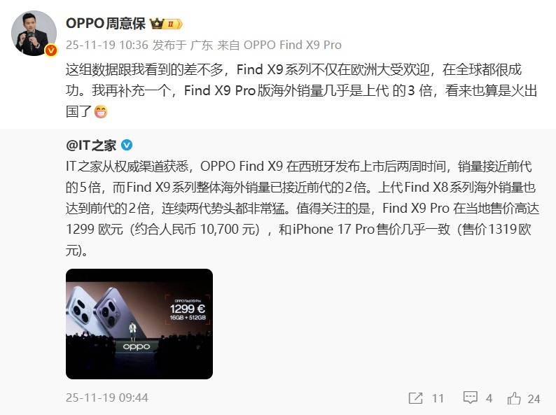 OPPO Find系列产品负责人@OPPO周意保随后转发并确认了相关数据,并指出OPPO Find X9系列在海外大受欢迎,Find X9 Pro在海外市场的销量几乎达到上代产品的3倍。他强调,这一表现不仅反映海外用户对产品体验提升的明显感知,也说明Find X系列正在全球高端智能竞争格局中稳步提升影响力,是真正意义上“火出国了”。