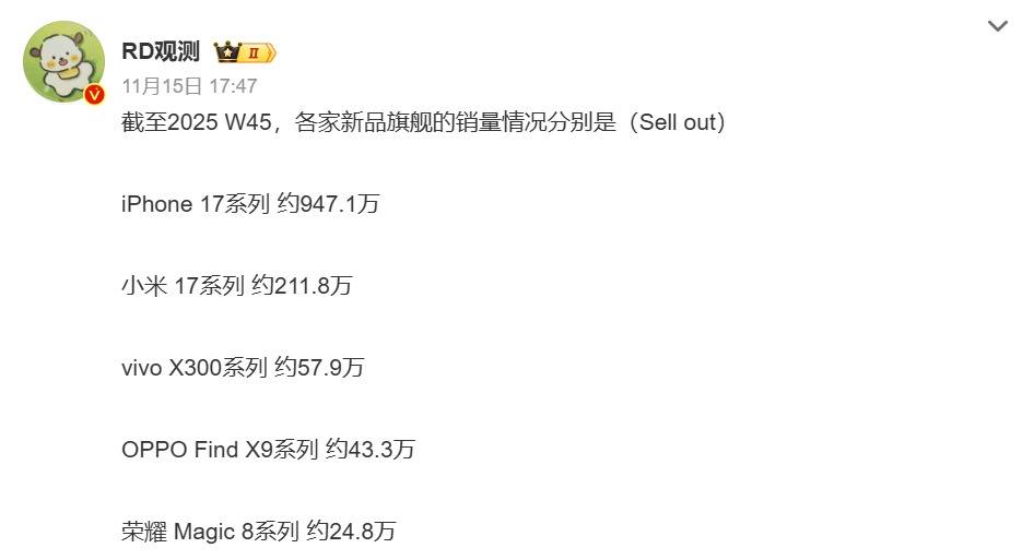 截至2025年W45,搭载天玑9500的vivo X300系列和OPPO Find X9系列表现异常抢眼,分别实现约57.9万台和43.3万台的销量,彰显联发科高端芯片在旗舰市场的强大竞争力。荣耀Magic 8系列约24.8万台,表现相对温和。整体来看,天玑9500已在高端旗舰市场形成显著影响力,成为品牌突围的重要利器。