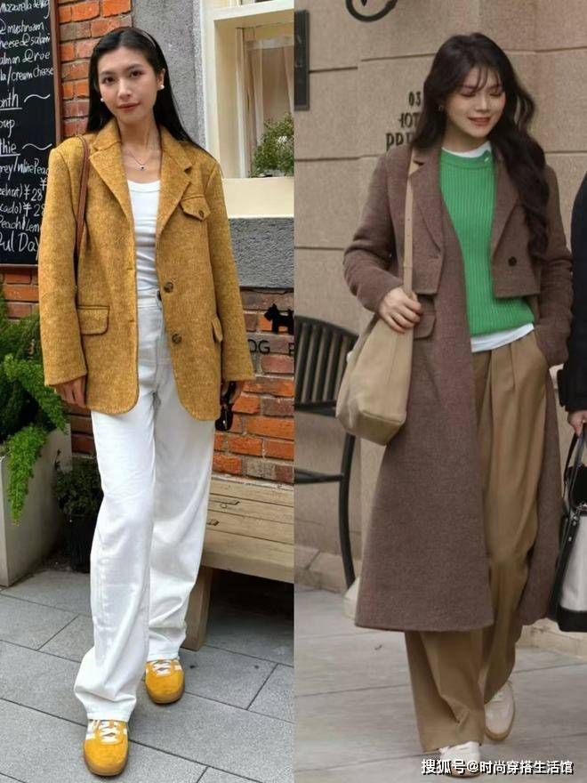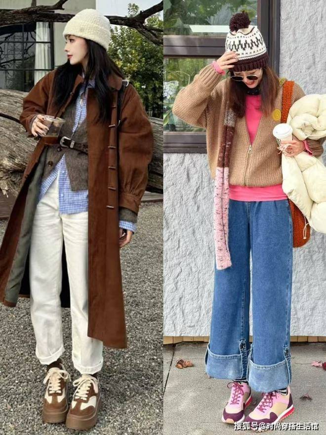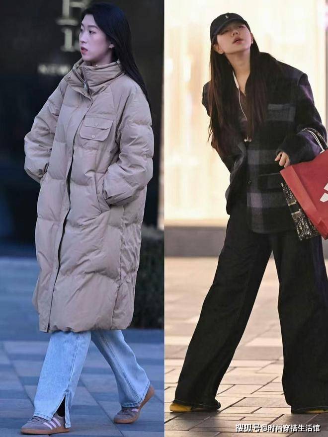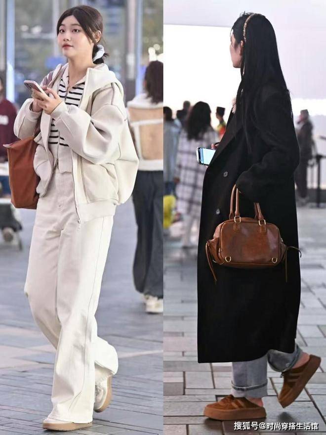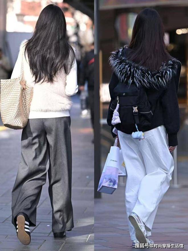⑵宽腿裤和德训鞋的搭配时髦保暖,适合冬天
